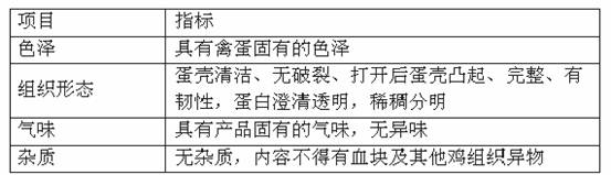 為貫徹預(yù)防為主的方針和執(zhí)行《中華人民共和國食品衛(wèi)生法》,加強對蛋與蛋制品的衛(wèi)生管理,提高蛋品質(zhì)量,保障人民身體健康,國家制定了蛋品衛(wèi)生標(biāo)準(zhǔn)。按照衛(wèi)生部提出的、原技術(shù)監(jiān)督局《鮮蛋衛(wèi)生標(biāo)準(zhǔn)》(GB2748—2003),鮮蛋的感官指標(biāo)和理化指標(biāo)應(yīng)達到下列要求。