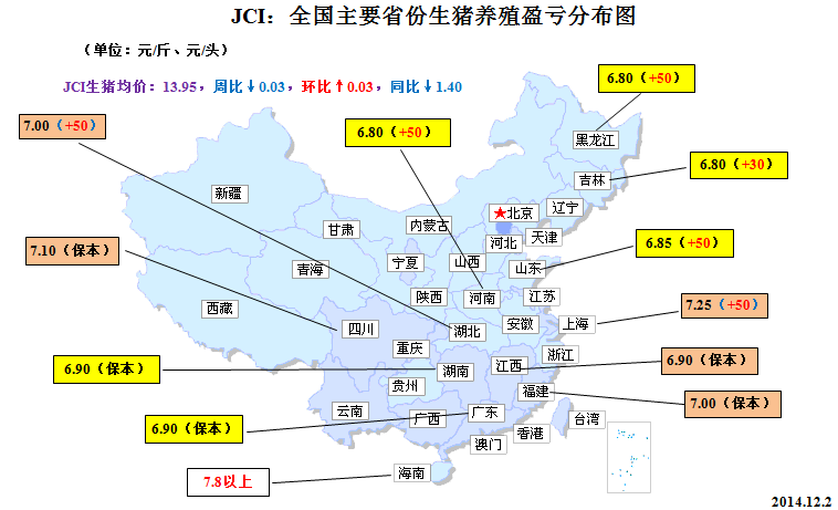 來自中國農(nóng)業(yè)部最新發(fā)布的統(tǒng)計報告--《2014年11月第2周(總第46周)畜產(chǎn)品、飼料集市價格》顯示,截至11月12日,全國生豬市場均價在14.10元/公斤,仔豬均價為21.51元/公斤,豬肉均價為23.19元/公斤,較10月均值分別下跌2.22%、8.19%和1.75%。盡管11月份我國生豬、仔豬和豬肉(白條肉)市場價格呈現(xiàn)全面回調(diào)格局,但是由于國內(nèi)豆粕、玉米包括相關(guān)飼料原料成本近來明顯回落,生豬價跌勢相對于飼料成本降幅較為溫和,全國大多數(shù)地區(qū)的養(yǎng)殖戶(場)仍然維持保本或微利狀態(tài)。如前文所述,進入12月份我國生豬市場依然存在需求推動型的反彈空間。